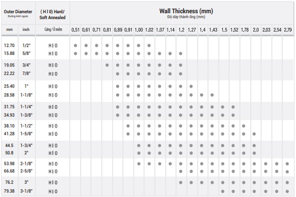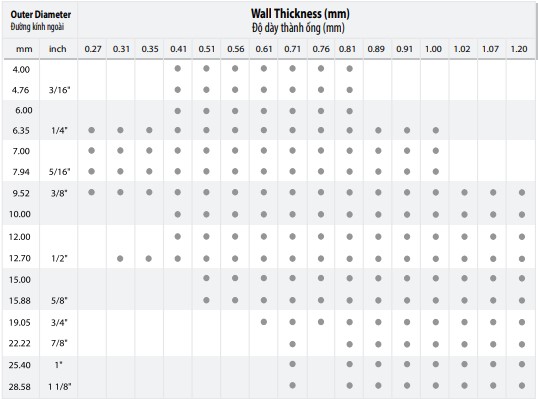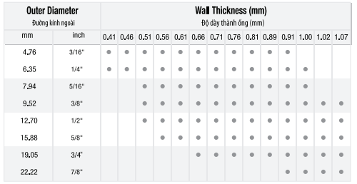 Sản phẩm có độ dày tối thiểu là 0.81mm đối với loại có đường kính ngoài (OD) 6.35mm, 9.52mm và 12.70mm, độ dày tối thiểu 1.00mm đối với loại có đường kính ngoài (OD) 15.88mm, 19.05mm.