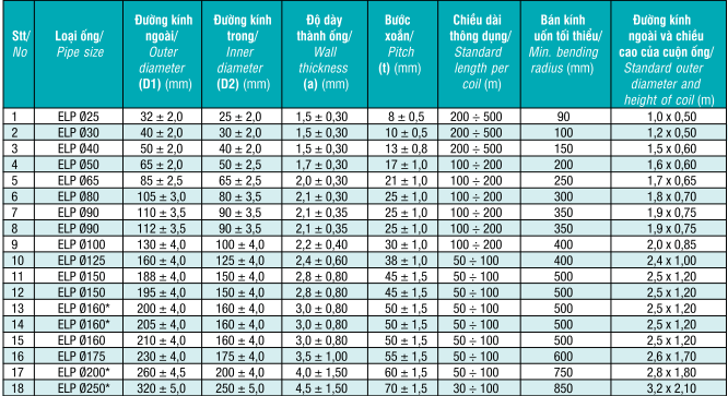 | Loại ống | Đường kính ngoài (D1) | Đường kính trong (D2) | Chiều dài cuộn ống | Đơn giá |