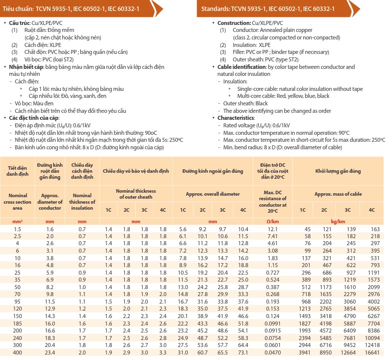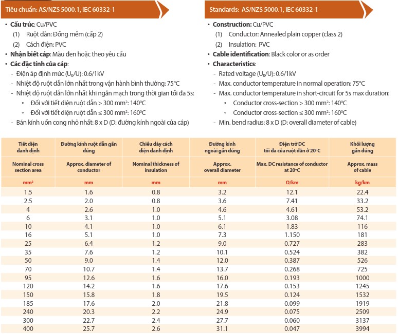 Cáp điện lực 1 lõi, ruột đồng, cách điện PVC Thịnh Phát – CV 0,6 / 1 kV